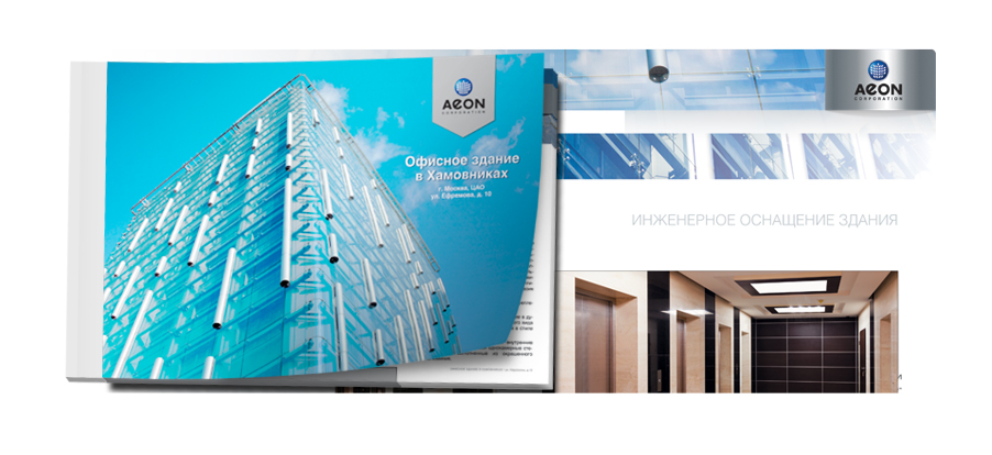 Представительская продукция: Брощюра, рассказывающая об офисном здании Корпорации AEON. Презентационная брошюра, как и само офисное здание, выполнена в стиле Hi-Tech. Шелкографическая печать на дизайнерской металлизированной бумаге Majestic «настоящее серебро» привносит металлический отблеск и глубину изображений, а матовое покрытие Silk Feel обеспечивает мягкие тактильные ощущения.